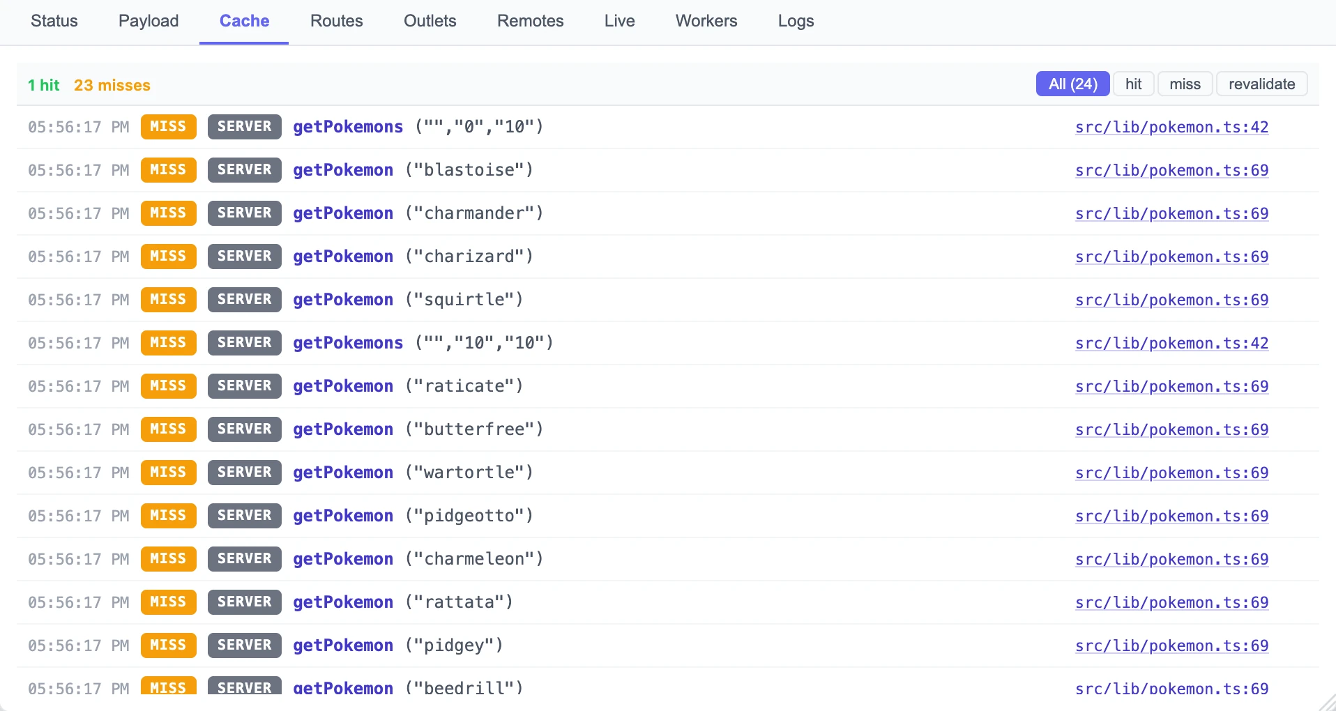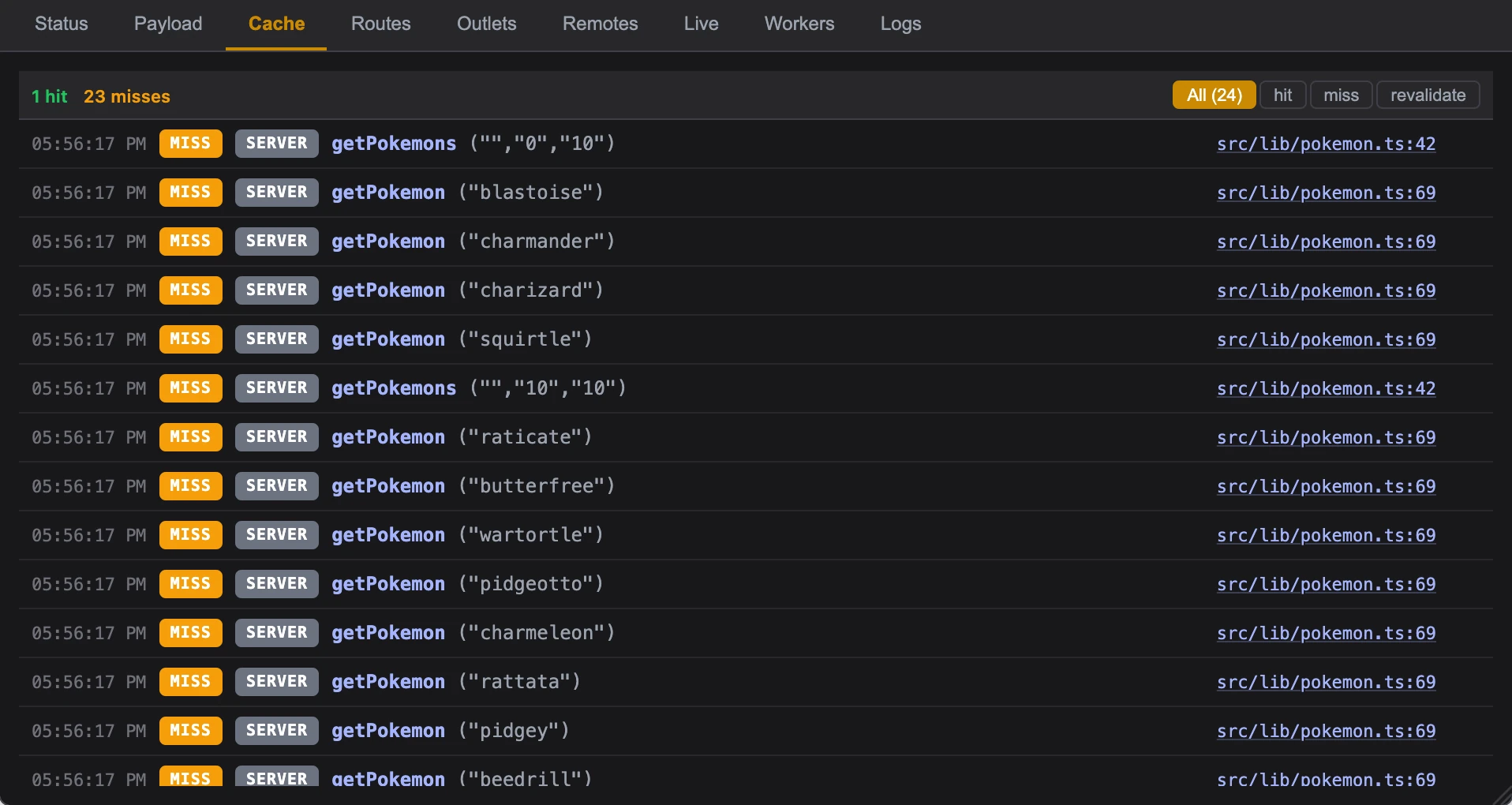 Cacheタブはサーバーとクライアントの両方で発生するすべての"use cache"呼び出しを記録し、ヒット、ミス、再検証のいずれかを表示します。