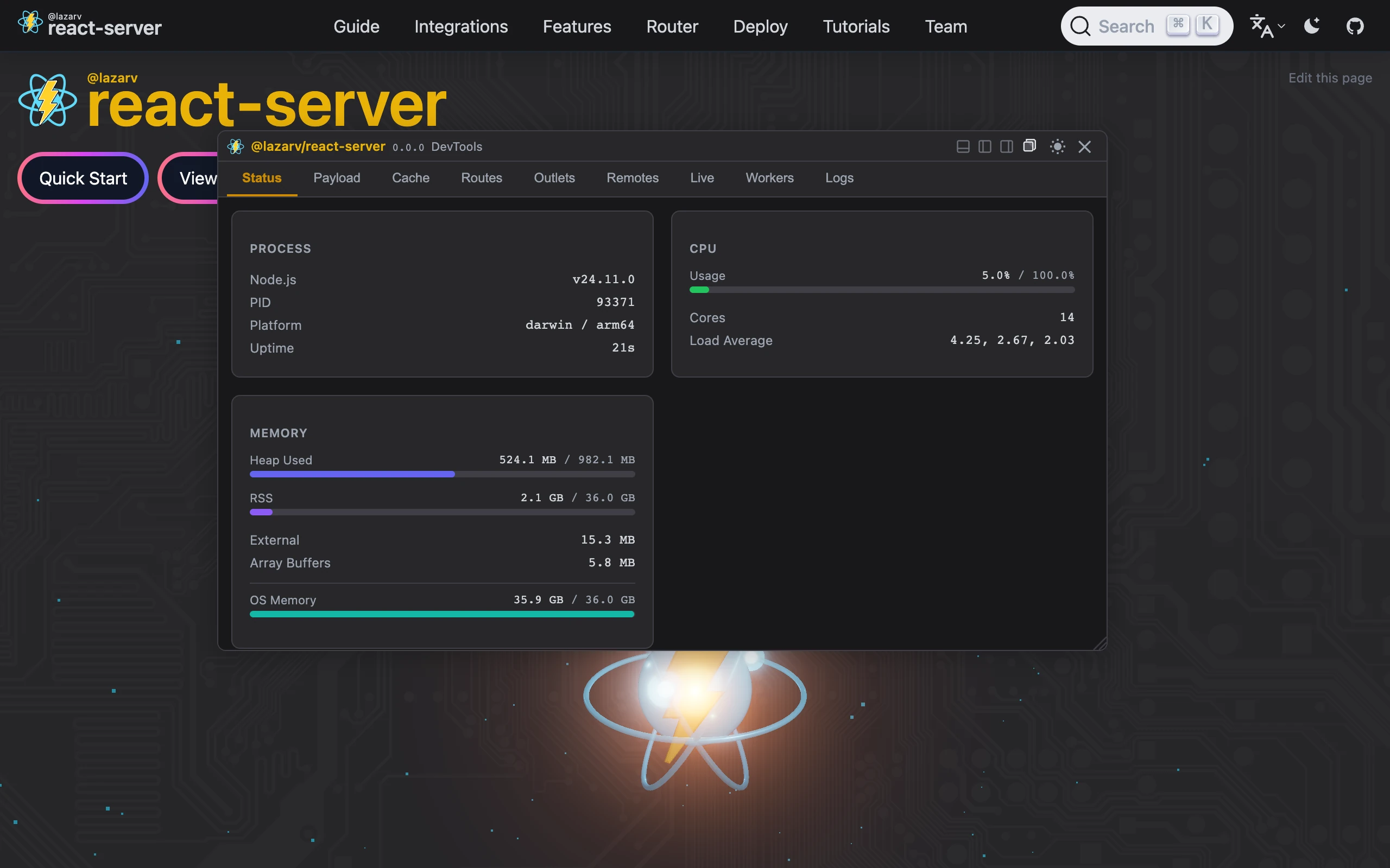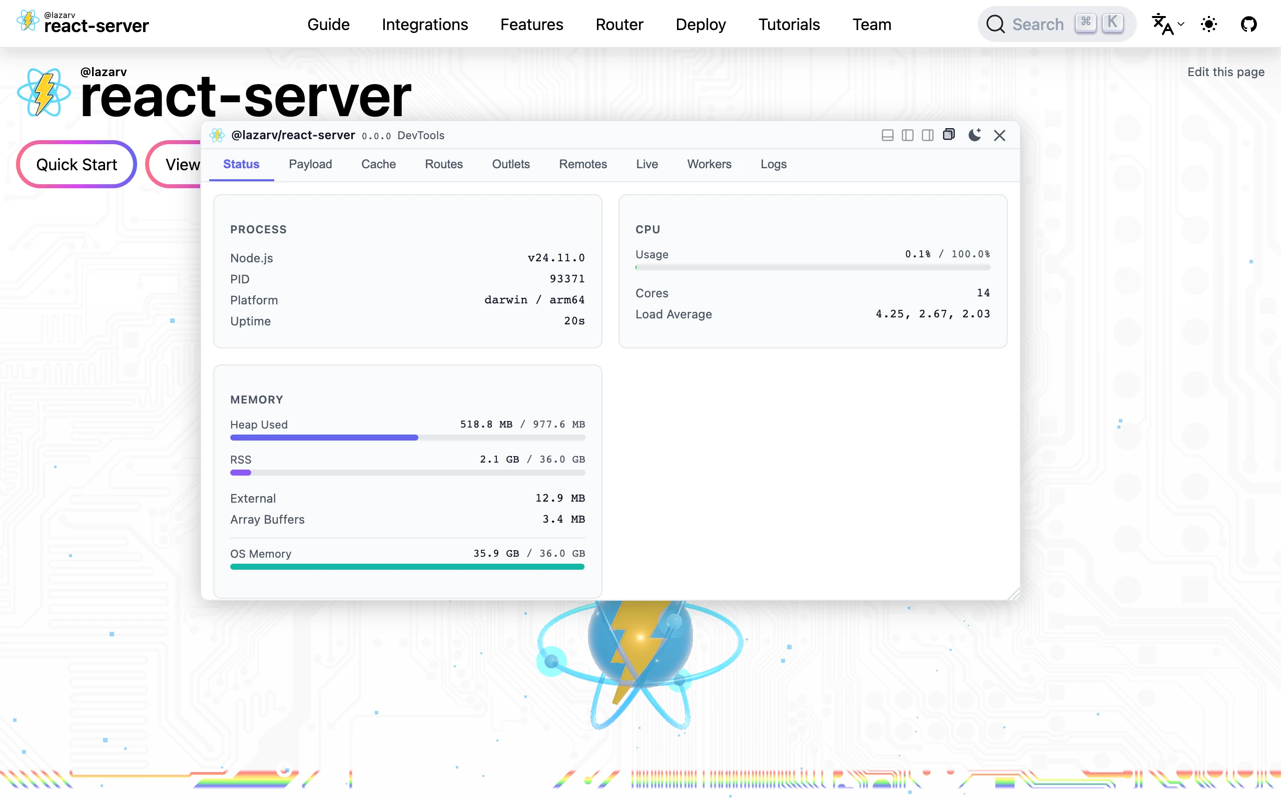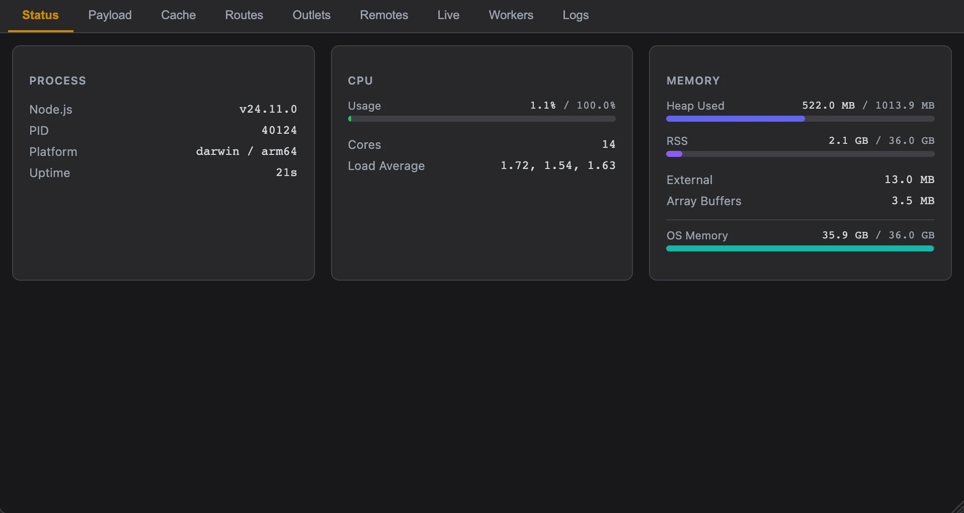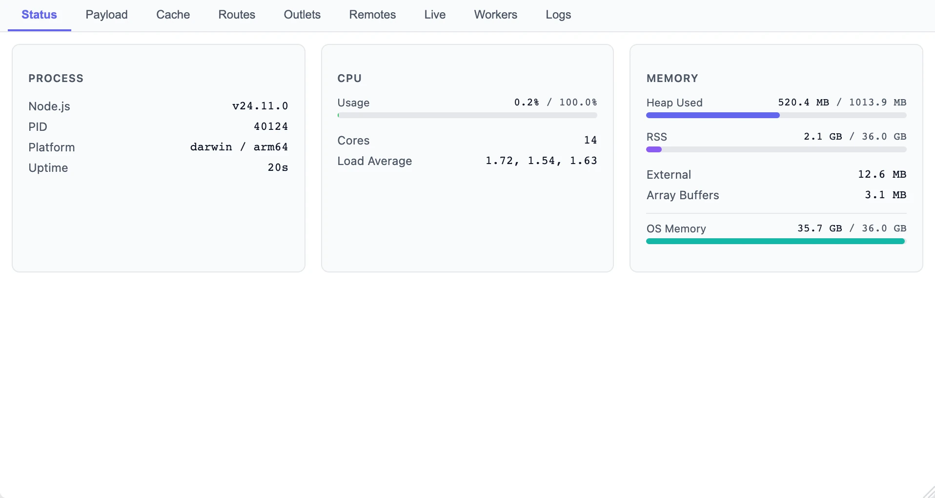 Statusタブは開発サーバーのリソース使用状況を表示します。毎秒新しいデータをストリーミングする"use live"コンポーネントです。
