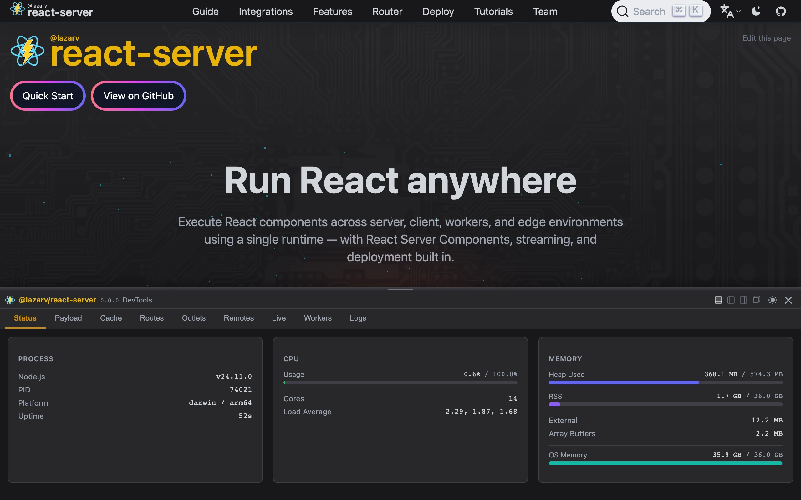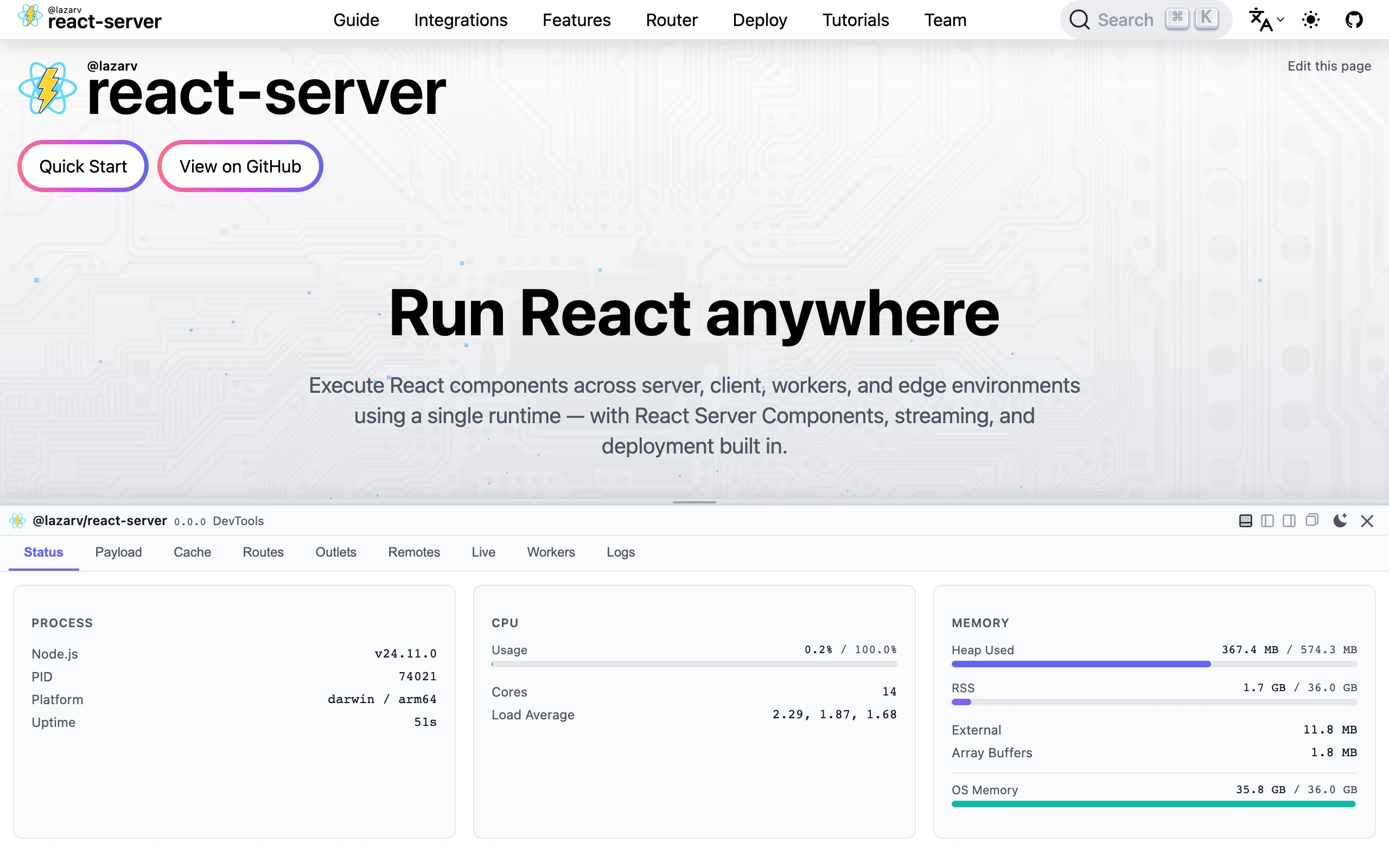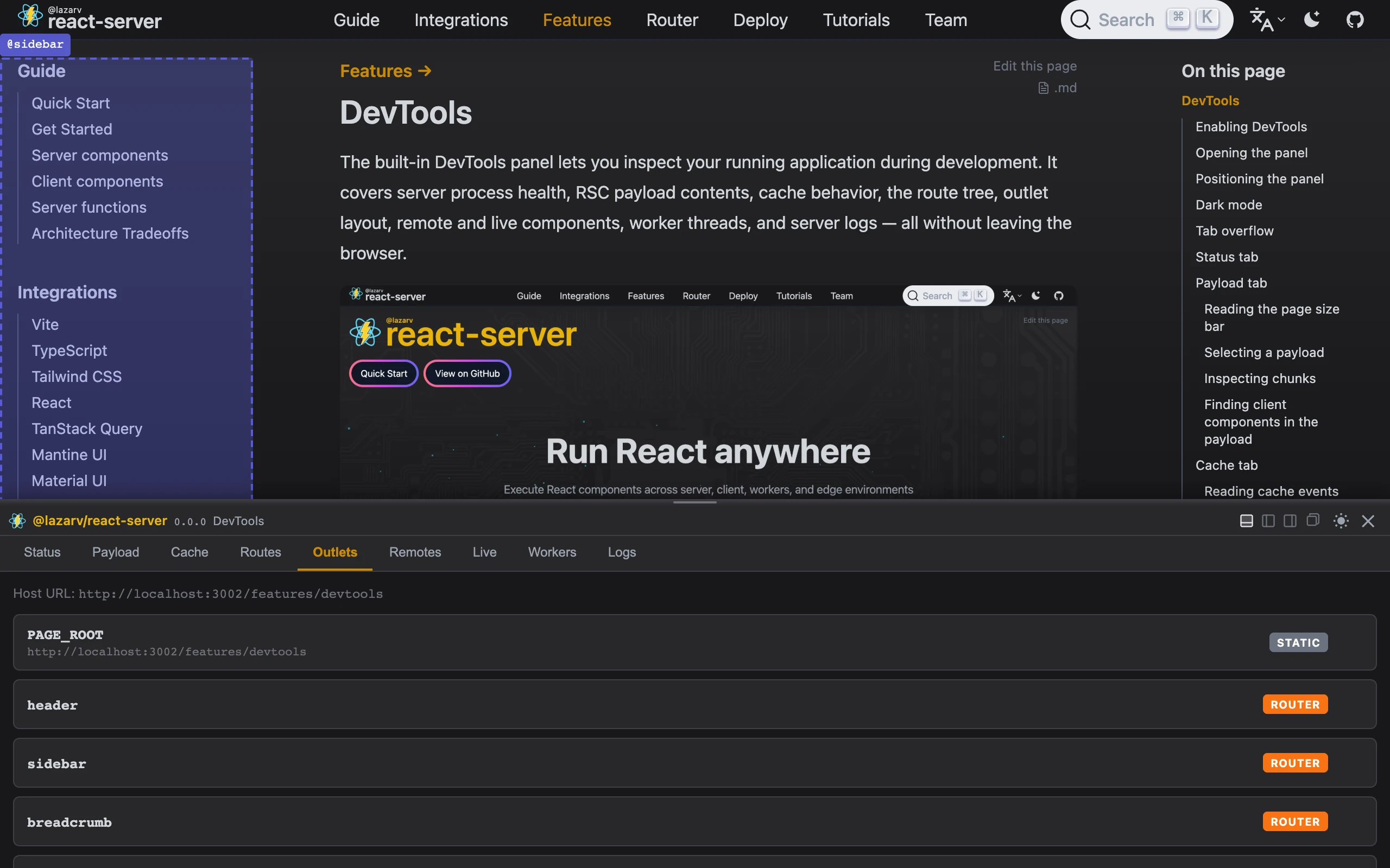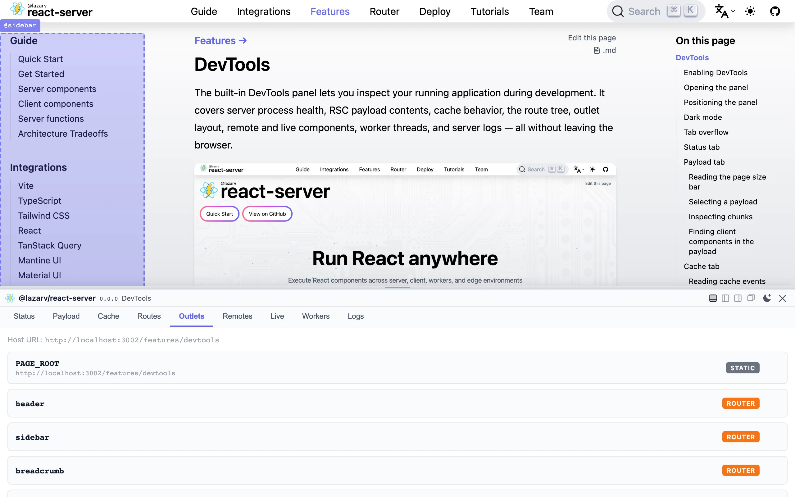 組み込みのDevToolsパネルを使うと、開発中にブラウザから離れることなくアプリケーションの動作を検査できます。サーバープロセスの状態、RSCペイロードの内容、キャッシュの動作、ルートツリー、アウトレットのレイアウト、リモート/ライブコンポーネント、ワーカースレッド、サーバーログをカバーしています。
