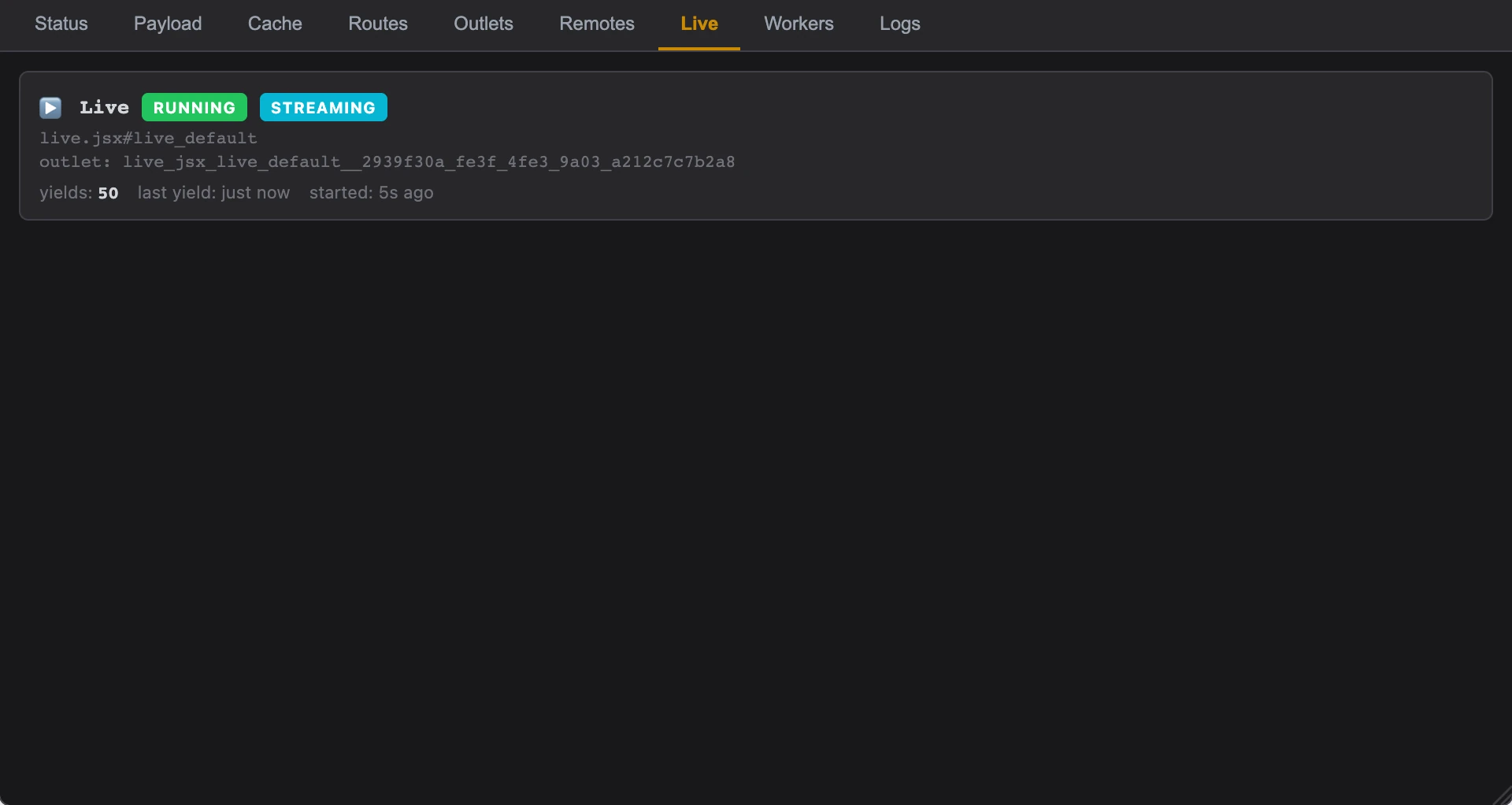 Liveタブはすべての"use live"コンポーネント — クライアントに連続的なレンダリングをyieldするサーバー上の非同期ジェネレーター関数 — を監視します。