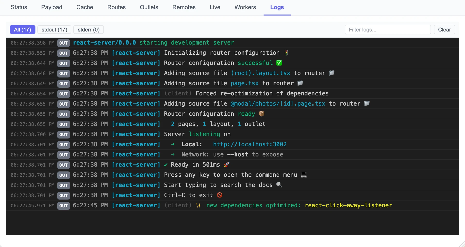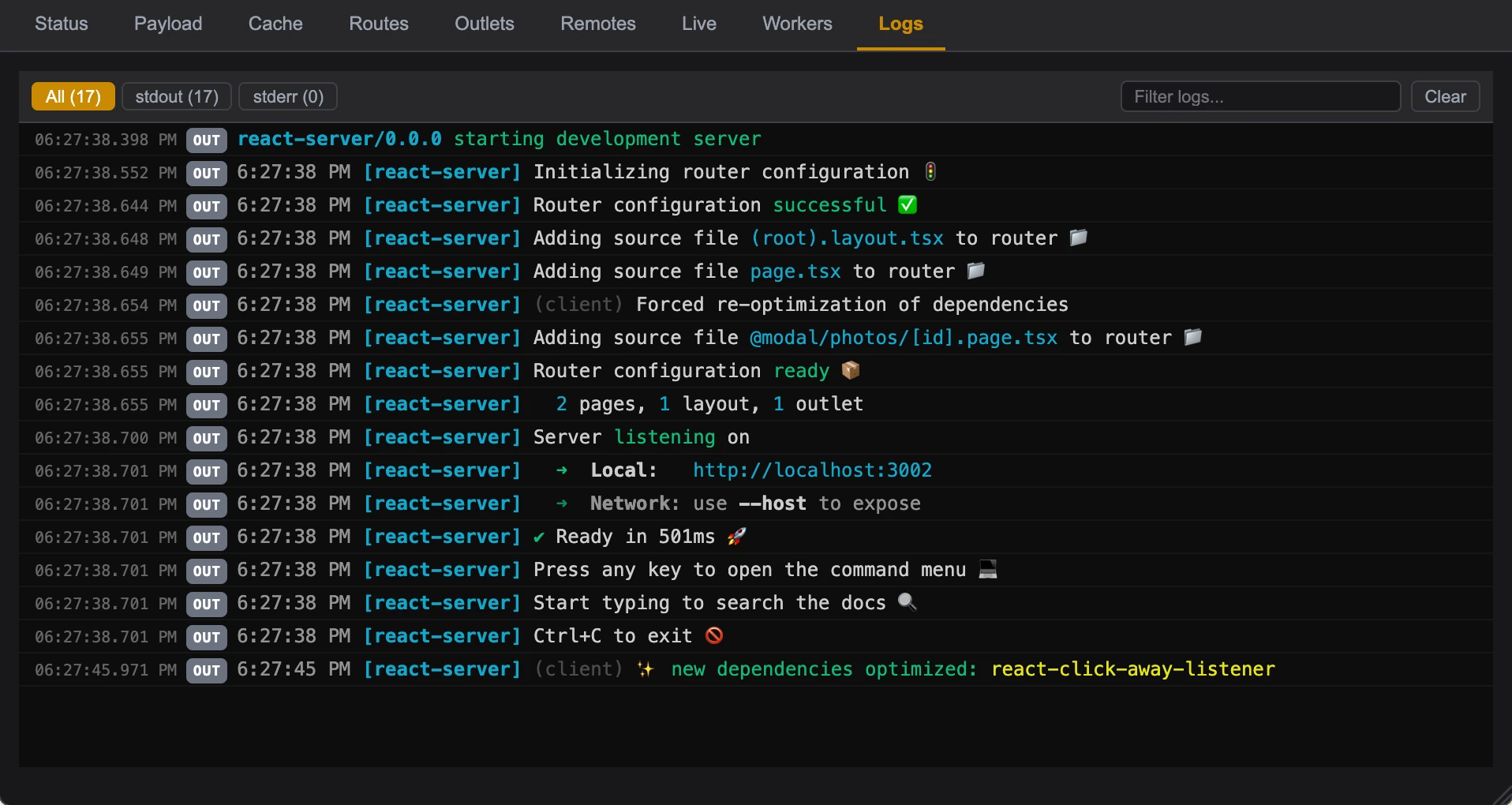 Logsタブはすべてのサーバーターミナル出力(stdoutとstderr)をブラウザにストリーミングするので、ターミナルに切り替える必要がありません。