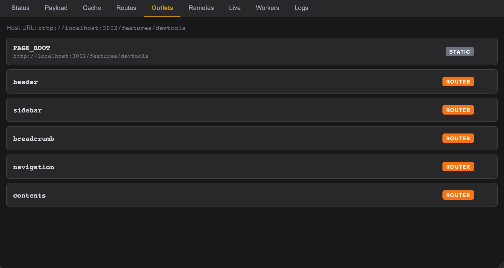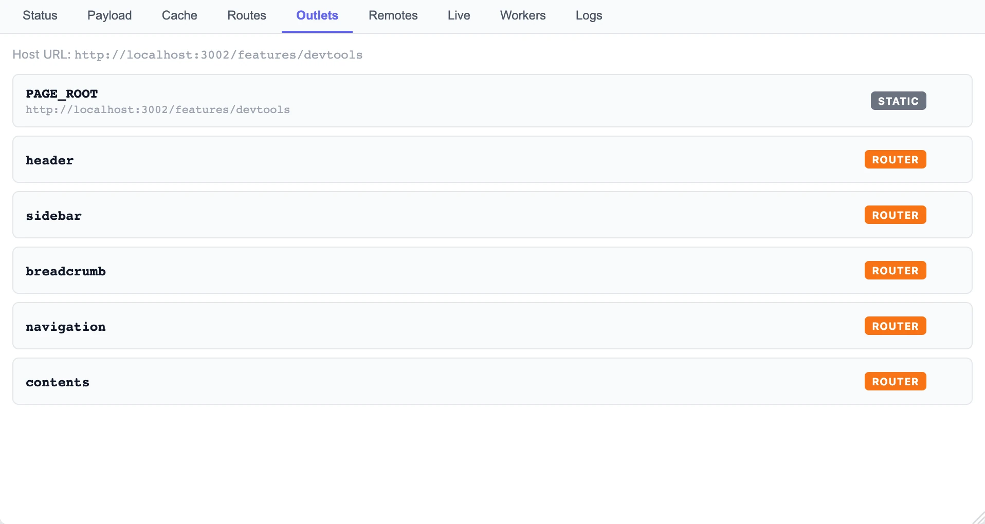 Outletsタブはページ上に現在レンダリングされているすべての名前付きアウトレットを一覧表示します。アウトレットとは、レイアウトがpropsとして受け取る名前付きスロット(@sidebar、@contentなど)と、ルートのレンダリングスロットであるPAGE_ROOTです。