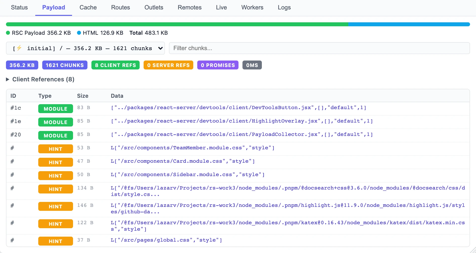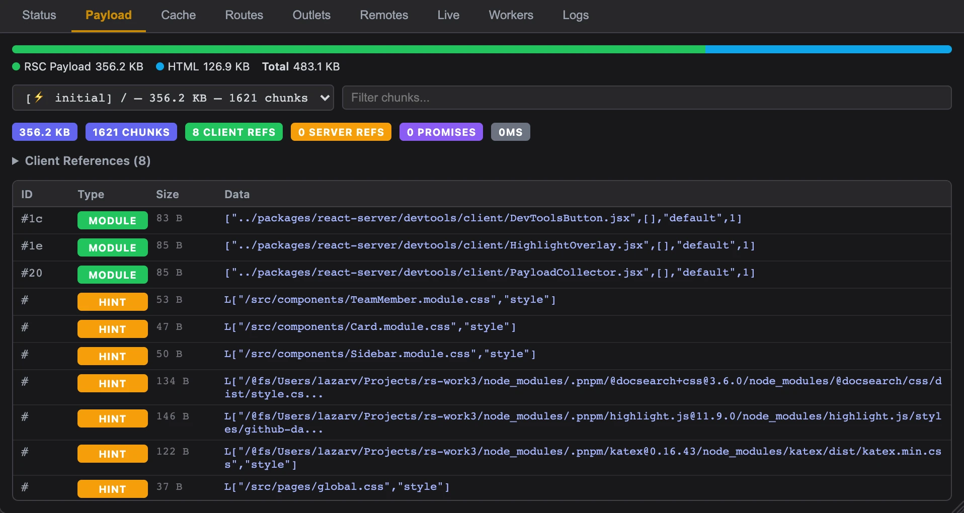 Client Referencesセクションを展開すると、サーバーが参照したすべての"use client"モジュールが表示されます。各エントリにはモジュールパスとエクスポート名が表示されます。参照にホバーすると、ページ上の対応するDOM要素が緑のオーバーレイでハイライトされます。参照をクリックすると、チャンクリストの対応するModuleチャンクにスクロールします。