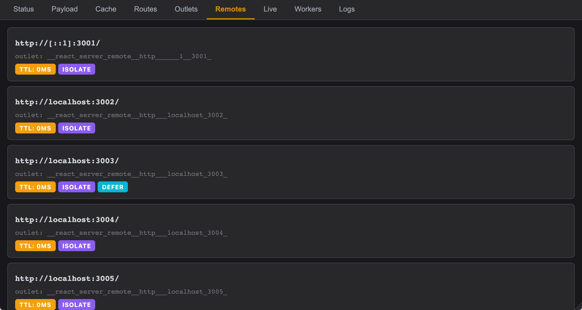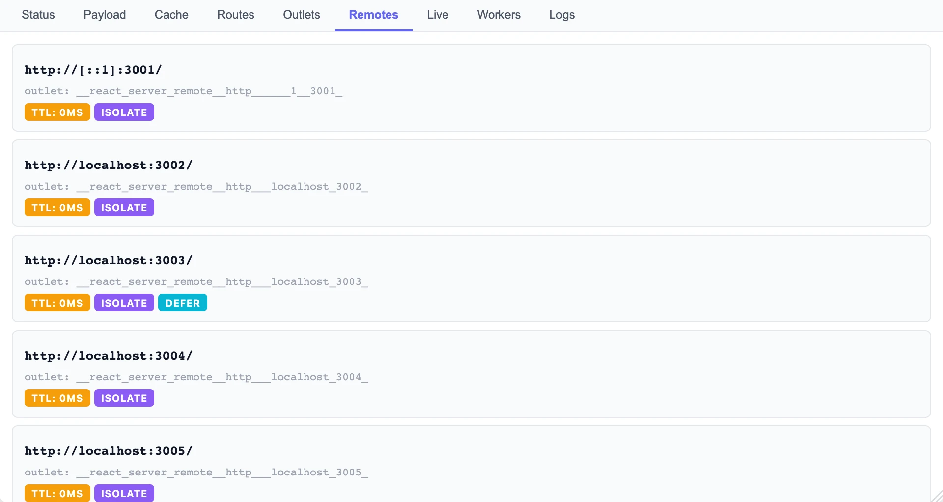 アプリが<RemoteComponent>を使って他のreact-serverインスタンスからRSCコンテンツをロードしている場合、Remotesタブに各コンポーネントが表示されます。