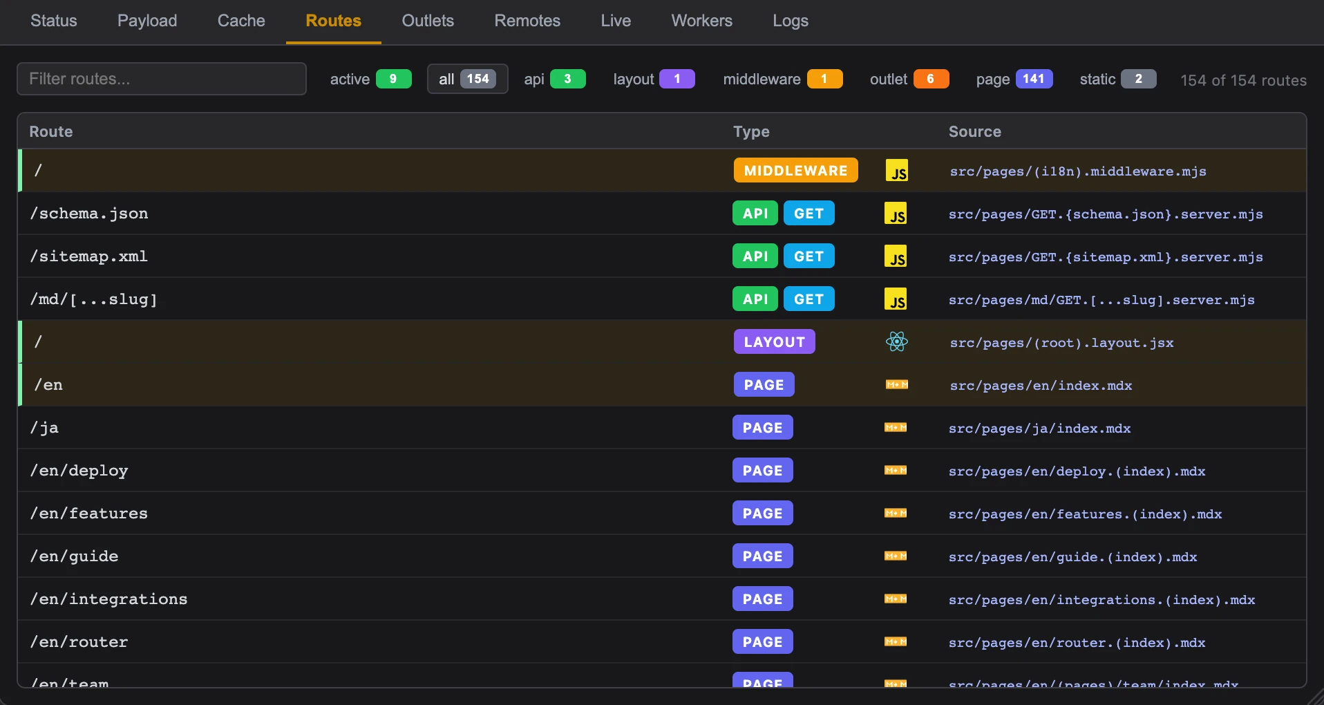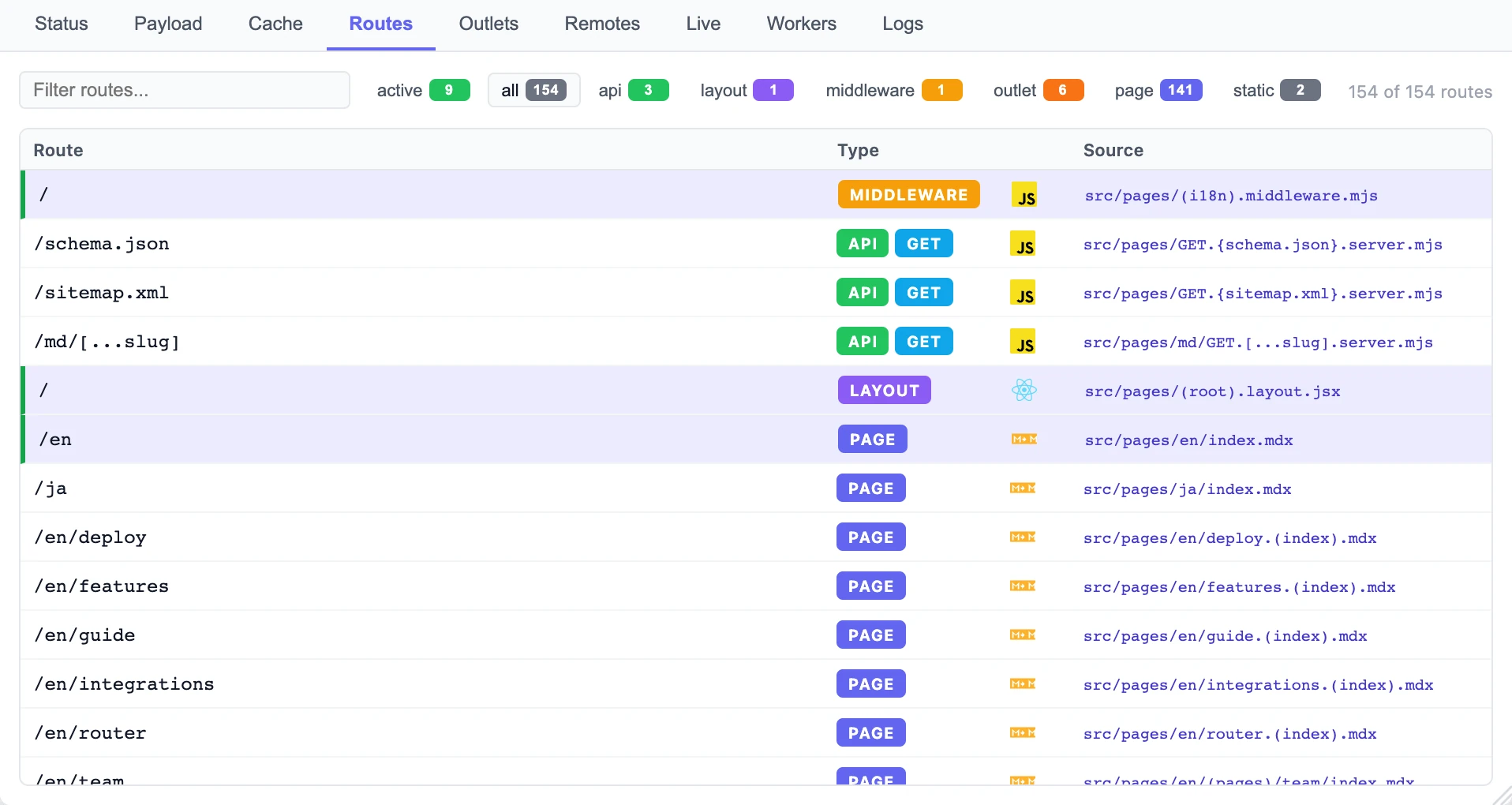| タイプボタン | タイプ(page、layout、middleware、api、error、loading、fallback、template、outlet)をクリックしてそのタイプのみ表示。各ボタンのカウントバッジにそのタイプのルート数が表示される |