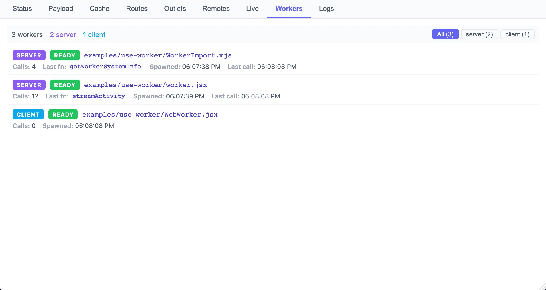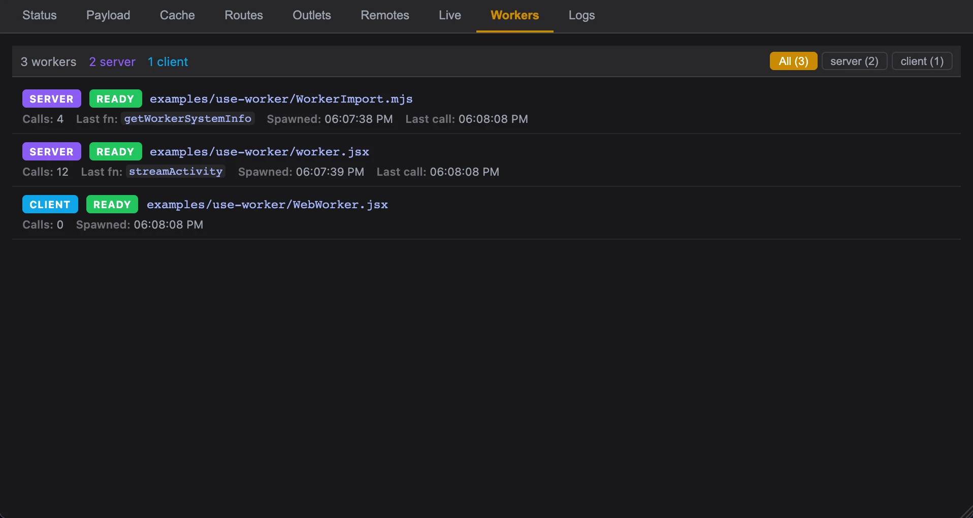 Workersタブは"use worker"スレッド — サーバーサイドのWorker Threads(Node.js)とクライアントサイドのWeb Workers — を追跡します。